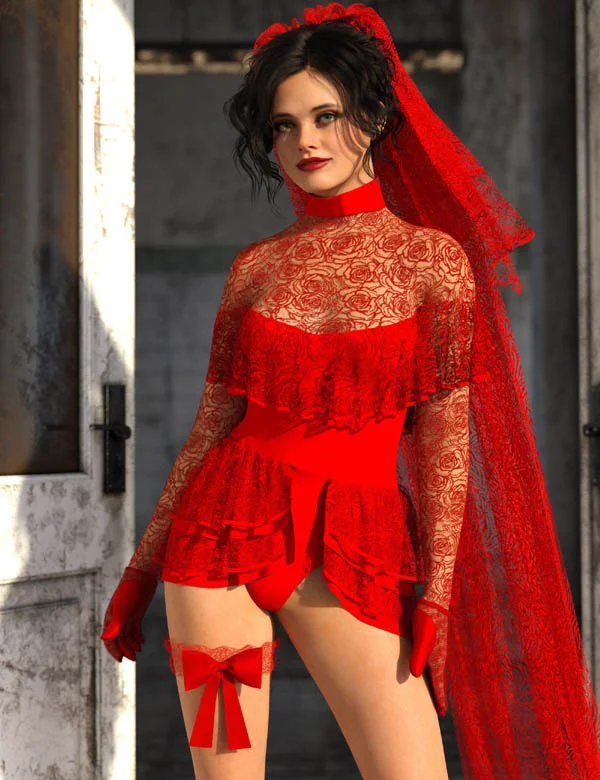 This four-piece set includes the Crimson Widow Dress, Veil, Gloves, and Garter, each engineered for visual impact and simulation-ready performance.