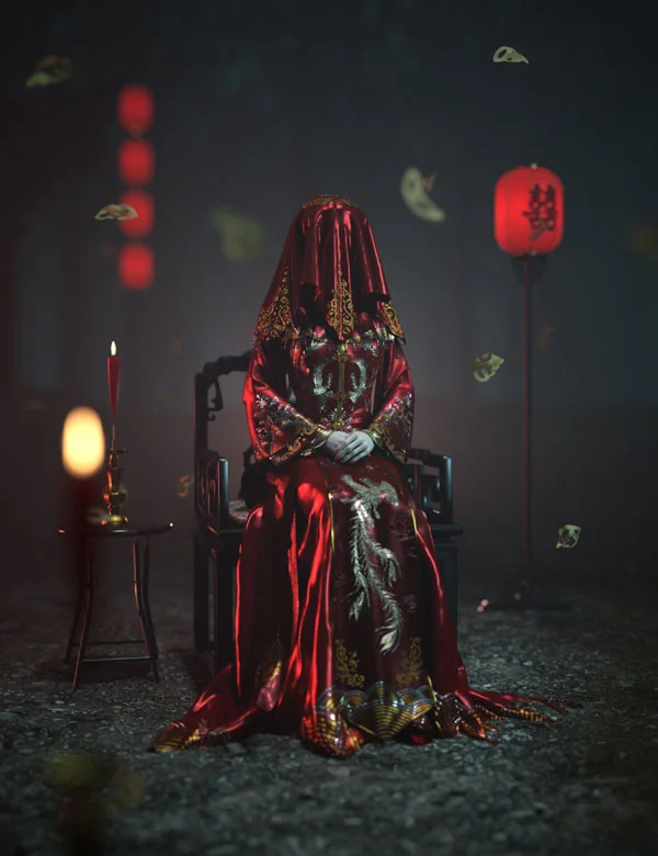 Although it is said to be the costume used by the ghost bride, the red and gold material presets can also be used in normal Chinese weddings.